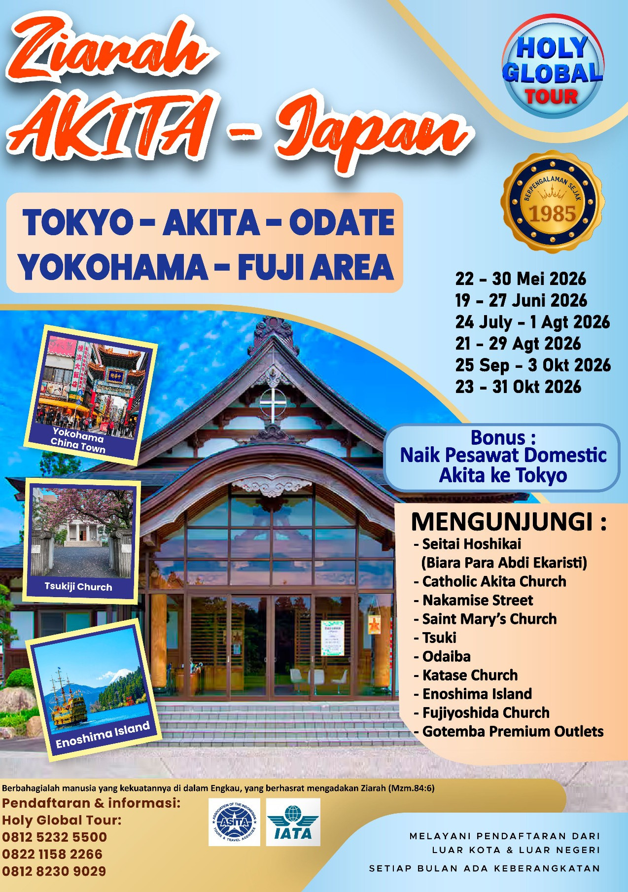 Setibanya di Tokyo, Haneda kita akan melanjutkan penerbangan ke Akita. Tiba di Akita, setelah proses imigrasi kita akan dijemput dan diantar untuk mengunjungi Seitai Hoshikai (Biara Para Abdi Ekaristi) dan The Garden of Mary – Our Lady of Akita untuk doa dan ziarah. Bermalam di Akita. (L/D)