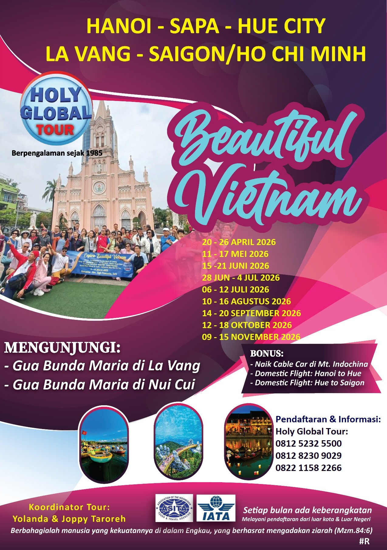 Hari ini kita menuju La Vang. Kita akan diajak berkunjung ke Santa Perawan Maria dari La Vang (Lourdesnya Asia) yang telah diakui Paus sebagai Gereja Basilica Minor La Vang dan